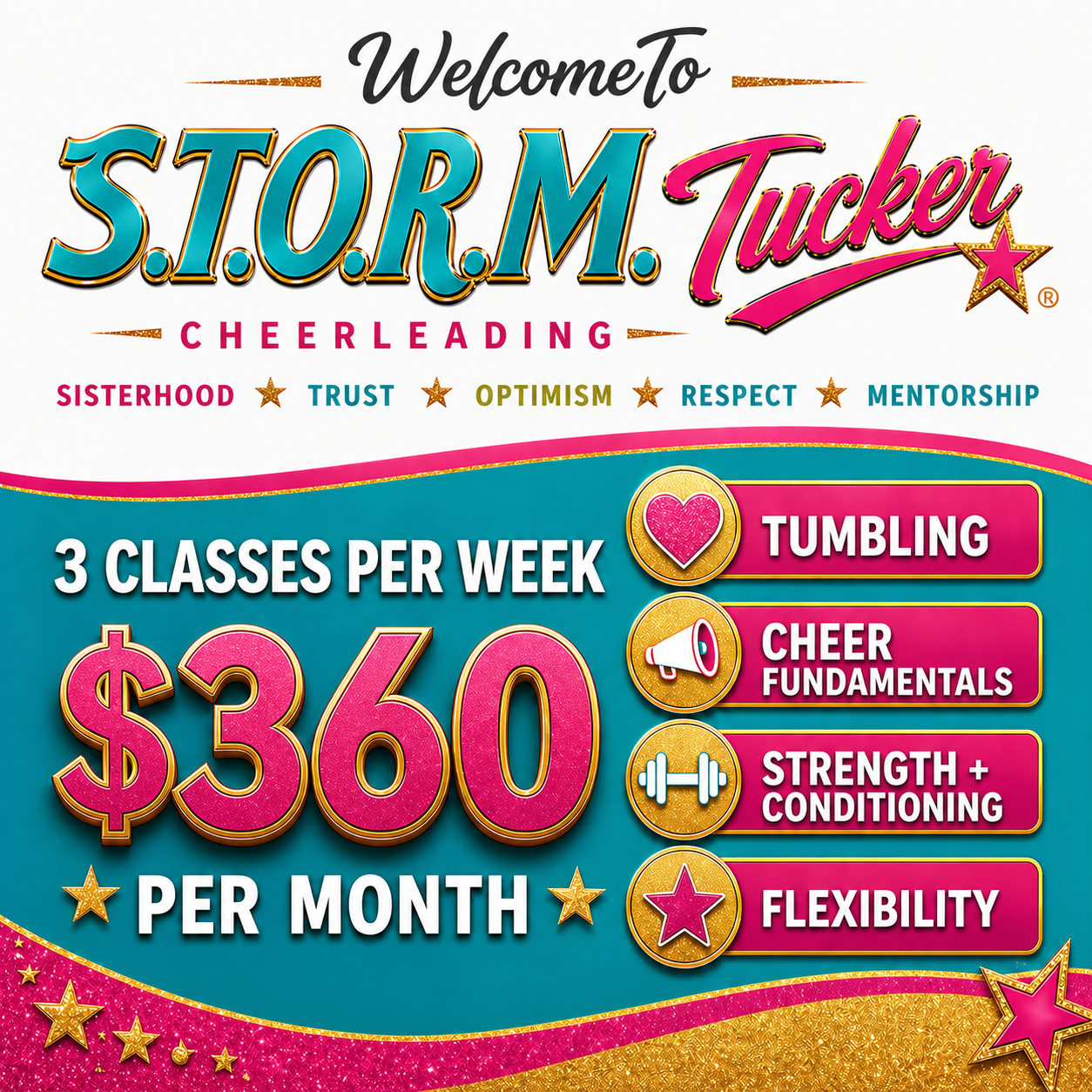 Our 3 Classes Per Week Membership is designed for dedicated athletes ready to maximize growth and accelerate results. Members receive three weekly classes focused on Tumbling, Cheer Fundamentals, Strength + Conditioning, and Flexibility. Perfect for athletes seeking rapid progress, stronger technique, increased confidence, and extra training in a fun, positive, and motivating environment.